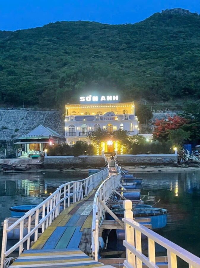 - Cây cầu gỗ dẫn vào nhà hàng Sơn Anh trên đảo Bình Ba – điểm check-in nổi bật giữa thiên nhiên biển đảo hoang sơ và thơ mộng.